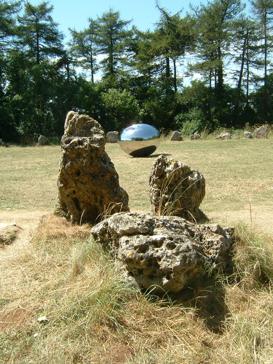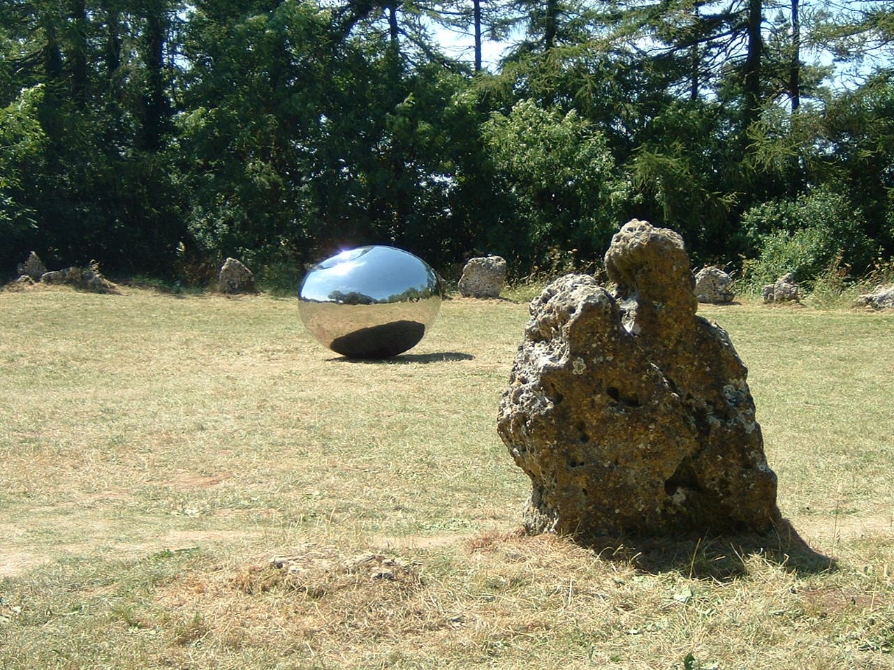 "Turning the world inside out" by Anish Kapoor was then on loan to the Rollrights from Bradford Museum, Galleries and Heritage and the large, highly polished stainless steel structre has been placed in the centre of the stone circle so reflecting all of the stones surrounding it.